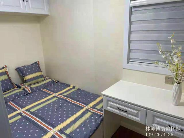小房间不大,只够放下一张床和一个书桌。床头做了吊柜来收纳。