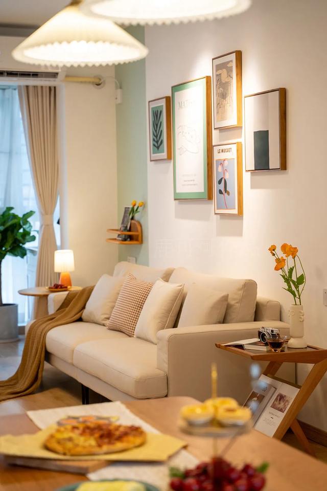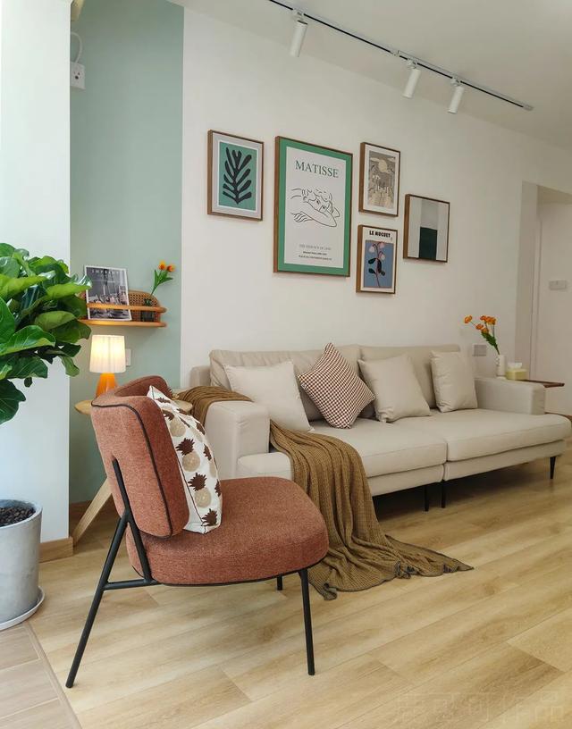 左面的背景墙留了一抹薄荷绿,与挂画的留白绿框相呼应,搭配了蜜糖红的单人位沙发,使清爽的客厅增添了一份活泼的氛围。