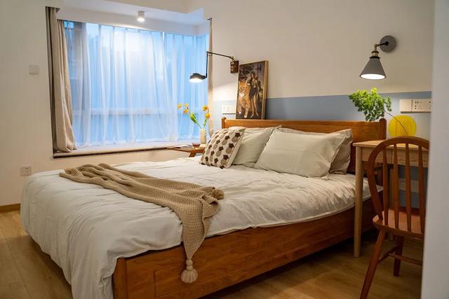 清爽混搭复古调调的卧室,背景是用莫兰迪甘蓝色做了半墙分色设计,樱桃木的家具与背景墙的撞色使空间的氛围变的很特别,温柔中夹杂着一丝冷静。