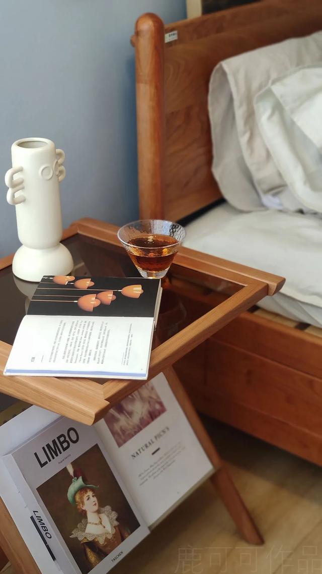 茶色玻璃面的床头柜,颜值较高。睡前一杯水,一本书,一个手机能放在床头柜就可以了。另一侧则是书桌,也可以是女主人的梳妆台。