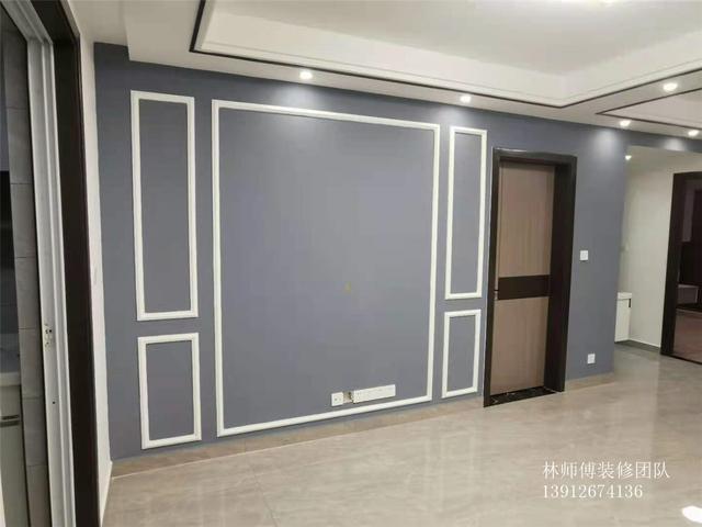 客厅宽敞明亮,浅灰色地砖也让客厅空间更显大气。雾霾蓝电视背景墙,并用石膏线勾勒造型,干净利落。