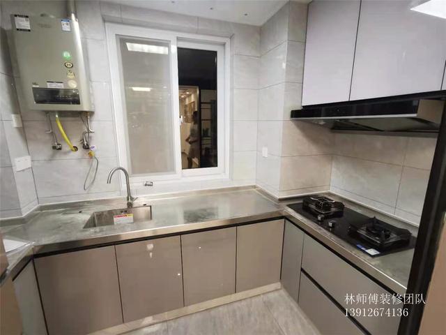 厨房U型设计,上下橱柜,收纳能力很强。香槟色橱柜和不锈钢台面非常相配,显得整个厨房非常时尚大气。