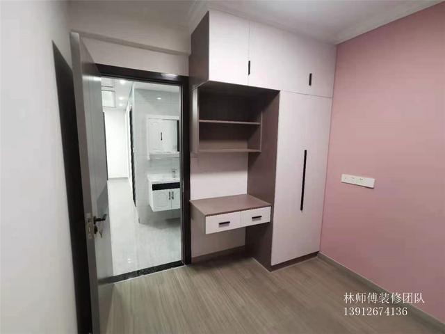 小房间也是儿童房,所以设计衣柜之余还做了一个书桌,方便孩子学习,床背景刷成了粉色,活泼可爱,符合孩子天真烂漫的性格。