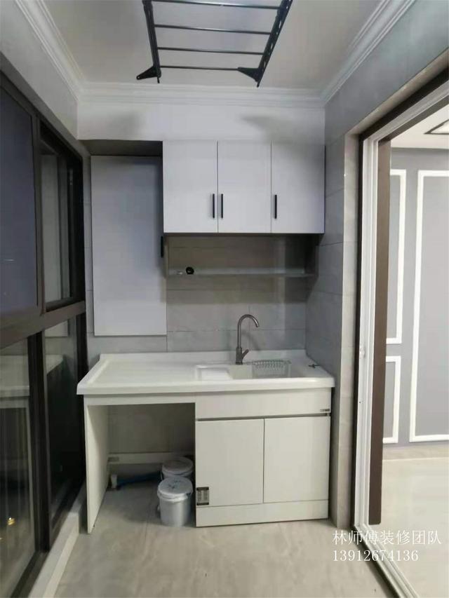 阳台区域主要是洗晒,洗衣机收纳进橱柜,整体统一。上下吊柜收纳能力也很强。吊柜下还贴心的设计了毛巾架,方便日后晾晒抹布等。