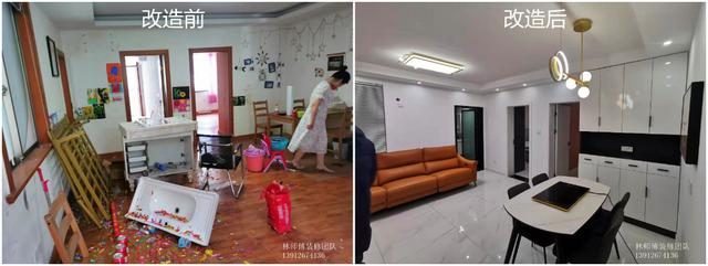 再往前走就是客厅区域,原本的装修颜色深,而且复杂的吊顶,让本身就层高不够的房屋看起来更加暗沉和压抑。改造后的客厅用了比较浅的颜色,也没有做复杂的吊顶,反而看起来更加明亮通透了。橙色的沙发点缀了整个客厅。