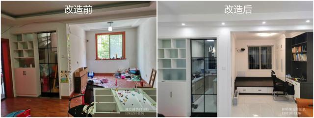 客厅边上还有一个空间,如果业主家有三房需要的话,这里也是可以隔出一个房间的,但是考虑到采光,业主觉得做一个开放式的书房更合适,榻榻米+书桌的组合,这样大人在办公的时候,也能时常看到玩耍的孩子,也能增加家里的收纳。非常实用。