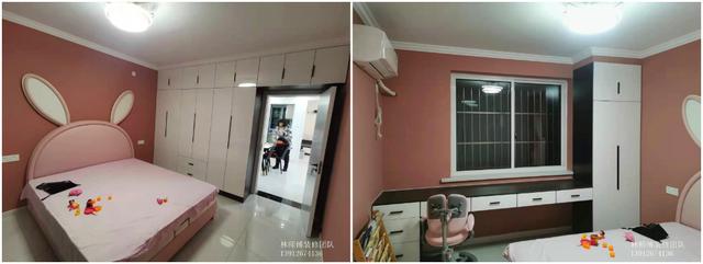 这是次卧的儿童房,为了符合孩子的天性,儿童房布置的可可爱爱,童趣十足。粉色的墙面,粉色的兔子形状的床,都是小女孩喜欢的。门口是橱柜,靠近窗户则设计了橱柜+书桌,并且书桌延伸到底,这样方便家长陪着孩子。