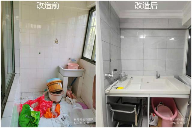 原来的阳台杂乱无章,而且非常简单,就一个水池。翻新后的阳台,非常注重整洁度,一体的台面,洗床单都没问题。洗衣机还能收纳到下面,看起来更整齐。