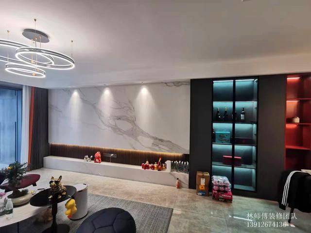 电视背景墙是一整面大理石,简约又大气。边上的深色玻璃橱柜作为展示区,两者一深一浅,一张一弛,瞬间格调感拉满。而沙发背景墙则是用的木饰面,柔和了整个空间,让整体感受更轻松。