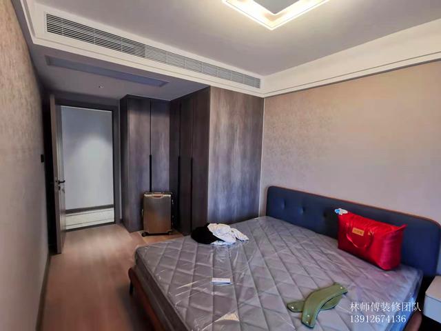 次卧以后可能是父母房,所以颜色相对沉稳一些。房间都贴了墙纸,看起来也是非常有质感的。再配上舒适的床垫和四件套,晚上一定能睡个好觉。