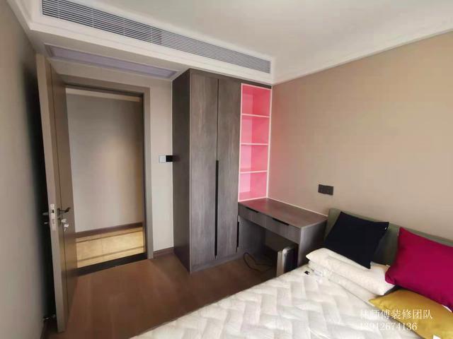 儿童房,墙面颜色一改之前的深沉,选择了皮粉,更加符合小孩子的年龄。衣柜延伸出来的书桌,方便孩子平时写作业。
