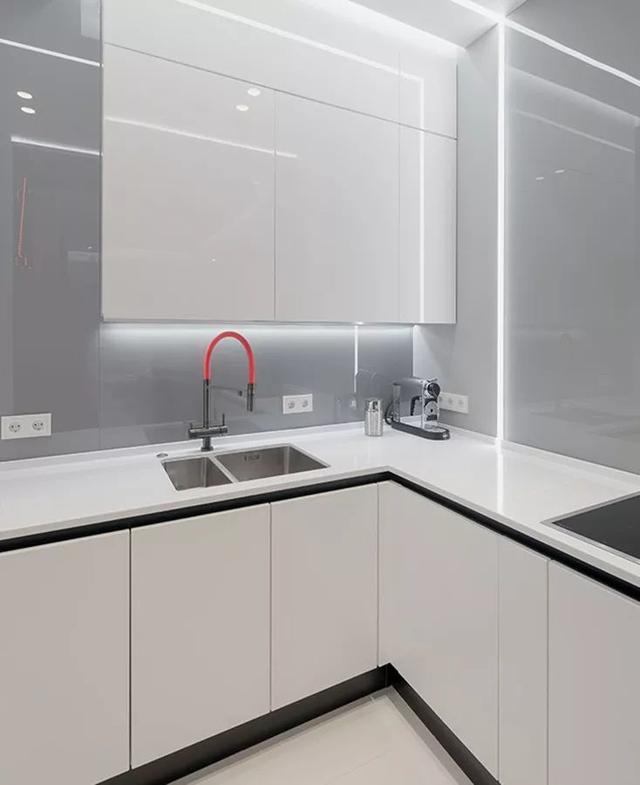 对于厨房来说,一盏灯顶灯完全解决不了实际需求,在厨房做饭时,橱柜与人必然形成暗区,这个时候在上橱柜设计多组LED,增强操作区光线是不可少的。