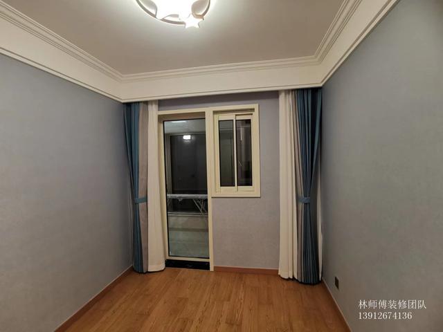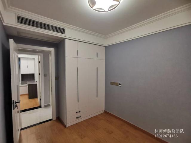 次卧是雾蓝色的墙面,白色的衣柜,清新自然,五角星吸顶灯非常可爱,用来作为儿童房非常合适。