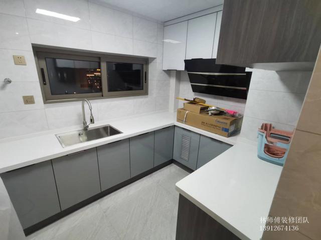 厨房是u型设计,储物能力非常强,灰色的橱柜搭配白色的台面和墙砖,非常清爽干净。