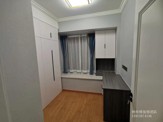这是小房间,面积比较小,所以打造了一个小书房,深色的书桌,让人更容易集中精神,书桌延伸到飘窗,做了一个书柜,可以收拾图书或者办公用品。后面的墙面做了衣柜,增加家里的收纳需求。