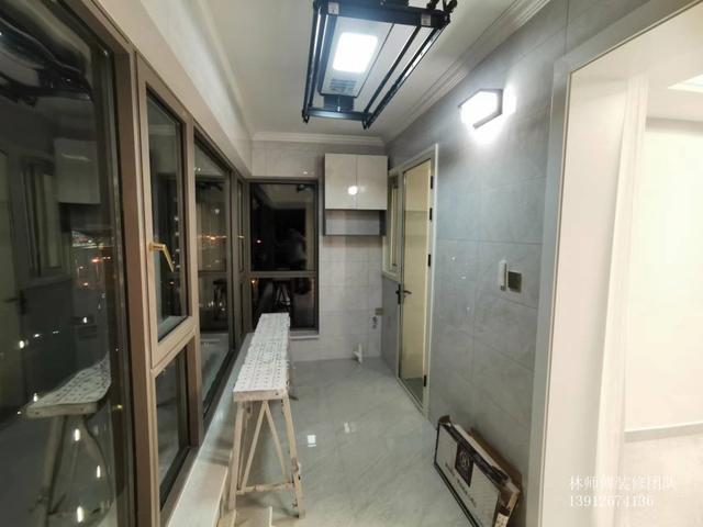 阳台很大,大大的落地窗,采光和视野都非常好。电动晾衣杆便利又好用。洗水池上方还做了吊柜,收纳一些洗衣用品很方便。