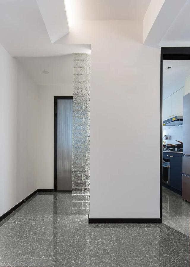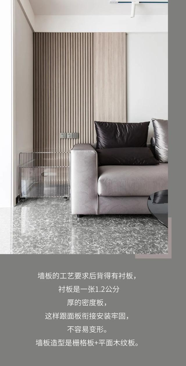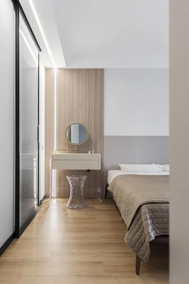 这是一套面积约为93平米的两居室,整体用浅灰色调搭配木色饰面板;墙面、顶面均为素面整洁材质与亮光的地面砖形成反差;整个空间由直线做主导,全屋为无主灯设计,使用了大量的线形灯和灯带,营造现代简约风格居室氛围。