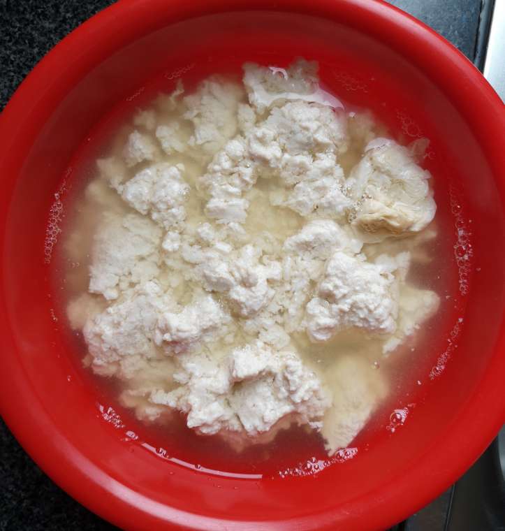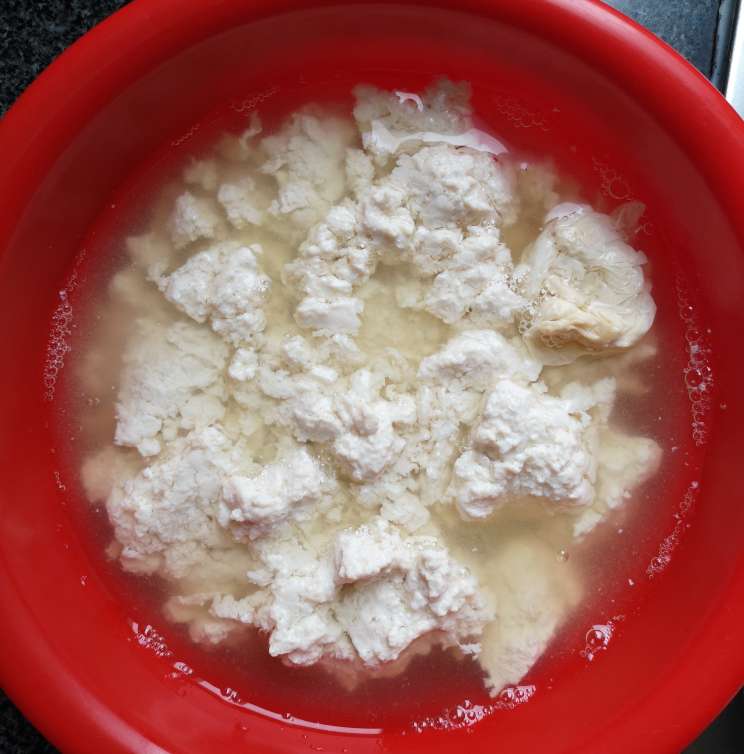 8. 把豆皮捞出来,把醋水倒入豆浆中,用勺子搅拌均匀,盖上盖子闷10-15分钟