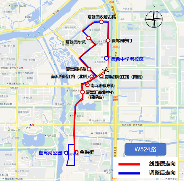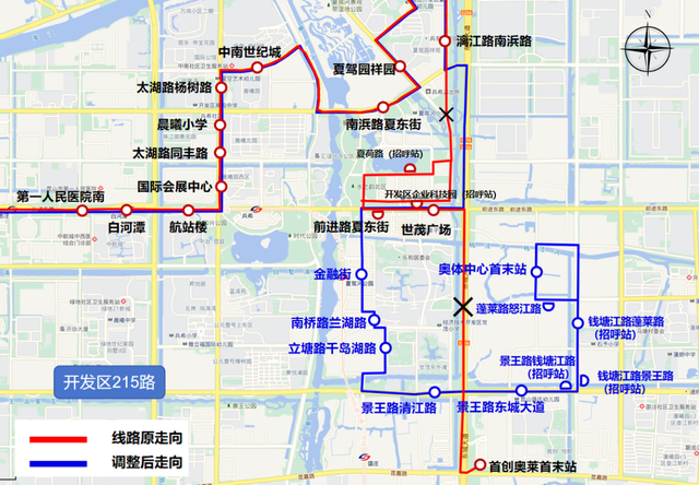 补充说明:因汾湖路(夏东街西侧)暂未通车,夏东街(汾湖路-翠湖路)段仍维持现状走向及站点,待汾湖路通车后调整至盛家庄路,增设“夏驾河公园(西侧)”