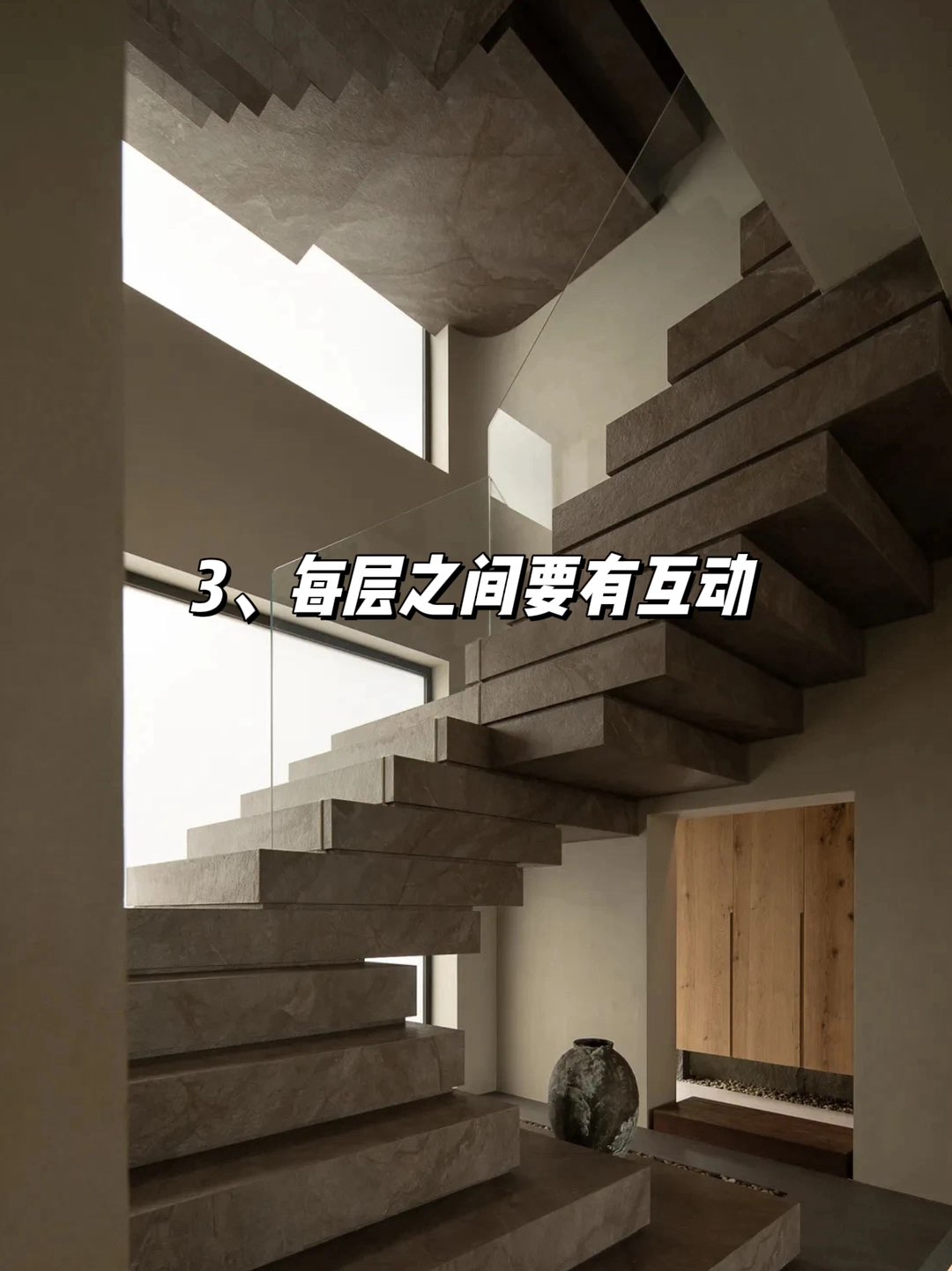 3、每层之间要有互动,通过局部挑空、旋转楼梯、下沉庭院等让房子活起来。