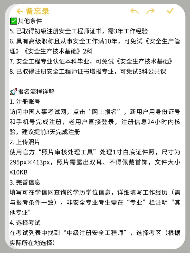 📌2025注册安全工程师报考指南💡报考时间节点⚠️报名时间:7月23日-8月13日(全国统一,登录中国人事考试网报名)⏰考试时间:10月25日-26日(分4个半天考4科,具体安排:第一天上午考法规,下午考管理;第二天上午考技术基础,下午考专业实务)📝准考证打印:考前1周登录官网下载,建议多打印2份备用📅成绩查询:考后2个月(12月下旬)📃证书领取:次年1-3月(电子证书同步发放,全国通用)📚报考条件(满足其一即可)✅学历+安全相关专业+工作年限1. 大专学历:安全相关专业5年工作经验,其他专业6年2. 本科学历:安全相关专业3年工作经验,其他专业4年3. 硕士学历:安全相关专业1年工作经验,其他专业2年4. 博士学历:安全相关专业或其他专业均需1年工作经验✅其他条件5. 已取得初级注册安全工程师证书,需3年工作经验6. 具有高级职称且从事安全工作满10年,可免试《安全生产管理》《安全生产技术基础》2科7. 安全工程专业认证本科毕业,可免试《安全生产技术基础》8. 已取得注册安全工程师证书增报专业,可免试3科公共课 昆山才思教育周老师19941908283玉山城北紫竹路九方街九栋三楼