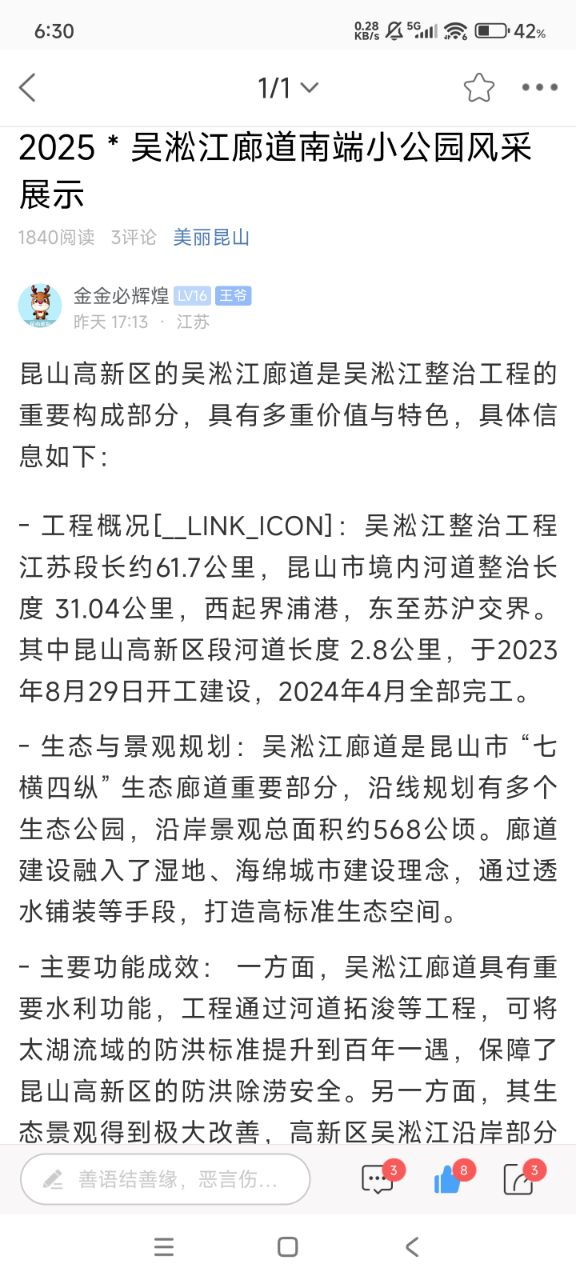 昆山高新区的吴淞江廊道是吴淞江整治工程的重要构成部分,具有多重价值与特色,具体信息如下: - 工程概况[__LINK_ICON]:吴淞江整治工程江苏段长约61.7公里,昆山市境内河道整治长度 31.04公里,西起界浦港,东至苏沪交界。其中昆山高新区段河道长度 2.8公里,于2023年8月29日开工建设,2024年4月全部完工。- 生态与景观规划:吴淞江廊道是昆山市 “七横四纵” 生态廊道重要部分,沿线规划有多个生态公园,沿岸景观总面积约568公顷。廊道建设融入了湿地、海绵城市建设理念,通过透水铺装等手段,打造高标准生态空间。- 主要功能成效: 一方面,吴淞江廊道具有重要水利功能,工程通过河道拓浚等工程,可将太湖流域的防洪标准提升到百年一遇,保障了昆山高新区的防洪除涝安全。另一方面,其生态景观得到极大改善,高新区吴淞江沿岸部分区域经生态修复后,已成为花草连绵、鸟类栖息的绿地,为市民提供了休闲去处。