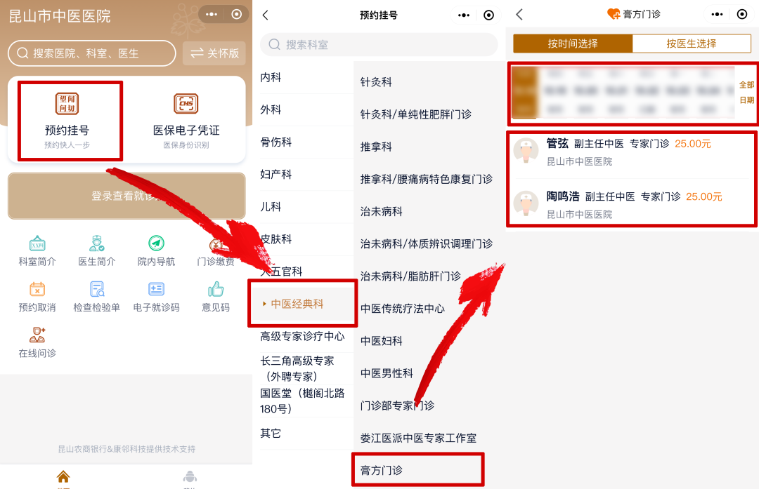 (1)市民可以登录昆山市中医医院微信公众号,或在医院人工收费窗口及自助挂号机预约。除了膏方门诊坐诊专家,您也可以选择各专科中医师开具。
