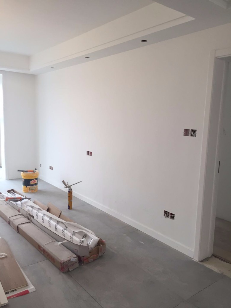 客厅很明亮,尽管是阴天,现场讨论电视墙的位置,要不要换个方向