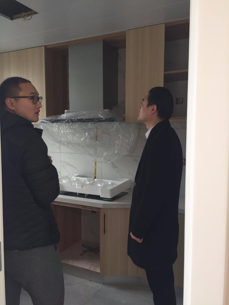 这是厨房,感觉油烟机有点矮了,商量调整方案。