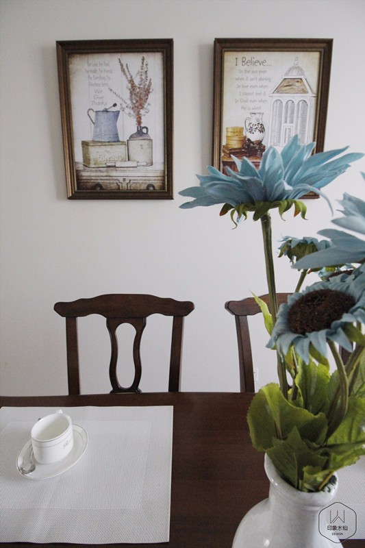 餐厅墙面以白色为主,棕色餐桌椅与客厅的设计呼应,搭配两幅棕色框架的装饰画,餐桌上的蓝色向日葵更显得年轻活力,再搭配一盏吊扇灯,整体餐厅显得格外有格调。