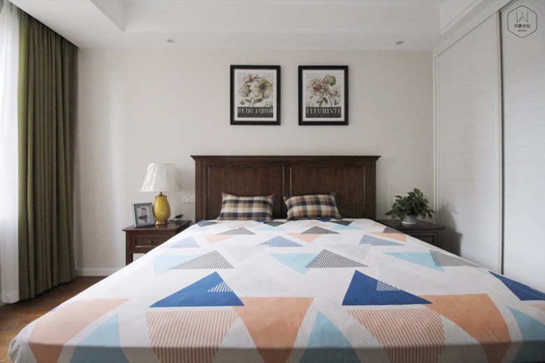 在卧室的设计上,温润的木制家具彰显着细腻与典雅,并通过精致的灯饰提升空间的格调,以床为视觉中心,米色为床头背景,再结合墨绿色窗帘,营造了整个空间温馨的古典气质。