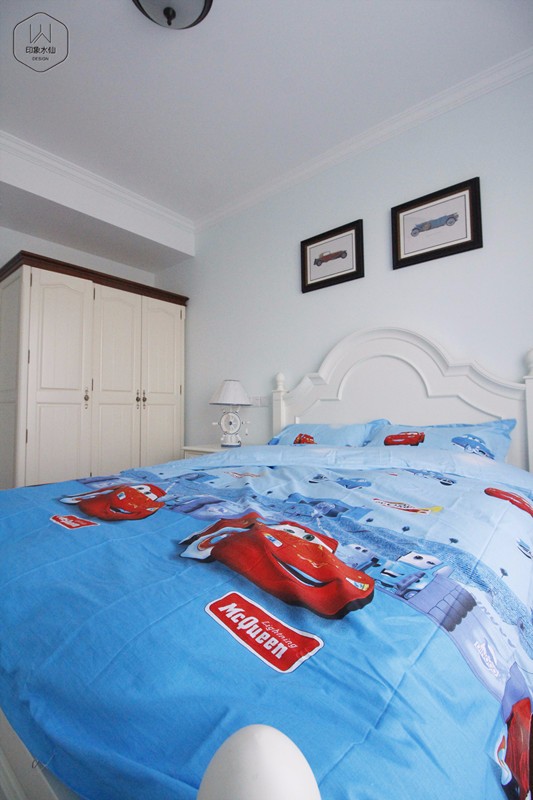 儿童房的装修是不容忽视的,本案以浅蓝色为主色调,搭配着两幅黑框卡通画,更有个性。卡通床饰搭配白色木质家具,整个环境非常适合孩子的成长。