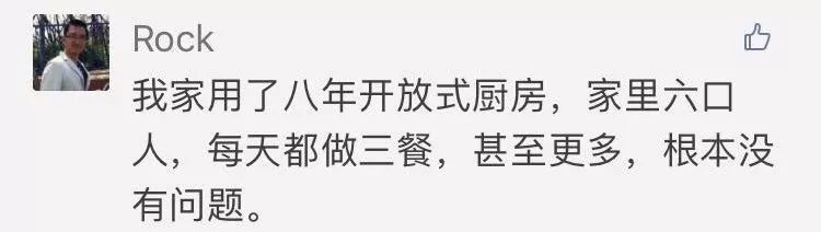 来看一下真正用过开放式厨房的人都怎么说,以下这些是小编在朋友圈文章里看到有关开放式厨房的网友留言截图,大家先来看看他们的评价吧: