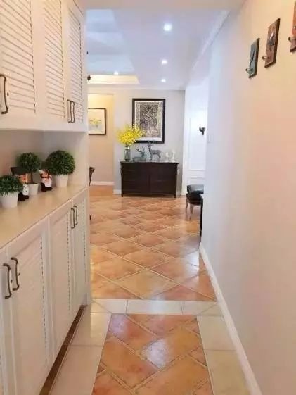 入户玄关采用地砖拼花,很适合现代和欧式的装修风格。通过多种颜色和质感的地砖互相拼接,能够呈现一种视觉的延伸感。