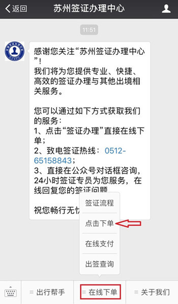 办理流程:第一步:关注 苏州签证办理中心 公众号;第二步:在公众号界面选择“在线下单→点击下单”选择对应国家,填写信息,申请办理签证,下载所需准备的资料;