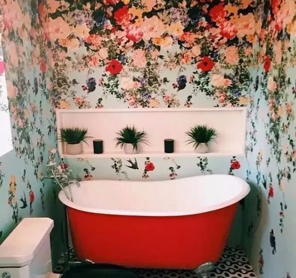 纯净舒适的色彩、仿真的绿植墙面,带来生机盎然的春意感,红色的浴缸大气简洁。
