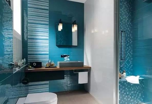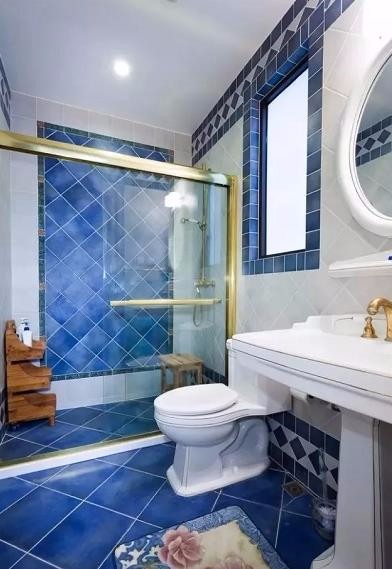 宝蓝色的瓷砖宛若蓝宝石,透明的玻璃隔断,仿佛徜徉在敞阔的海洋中。