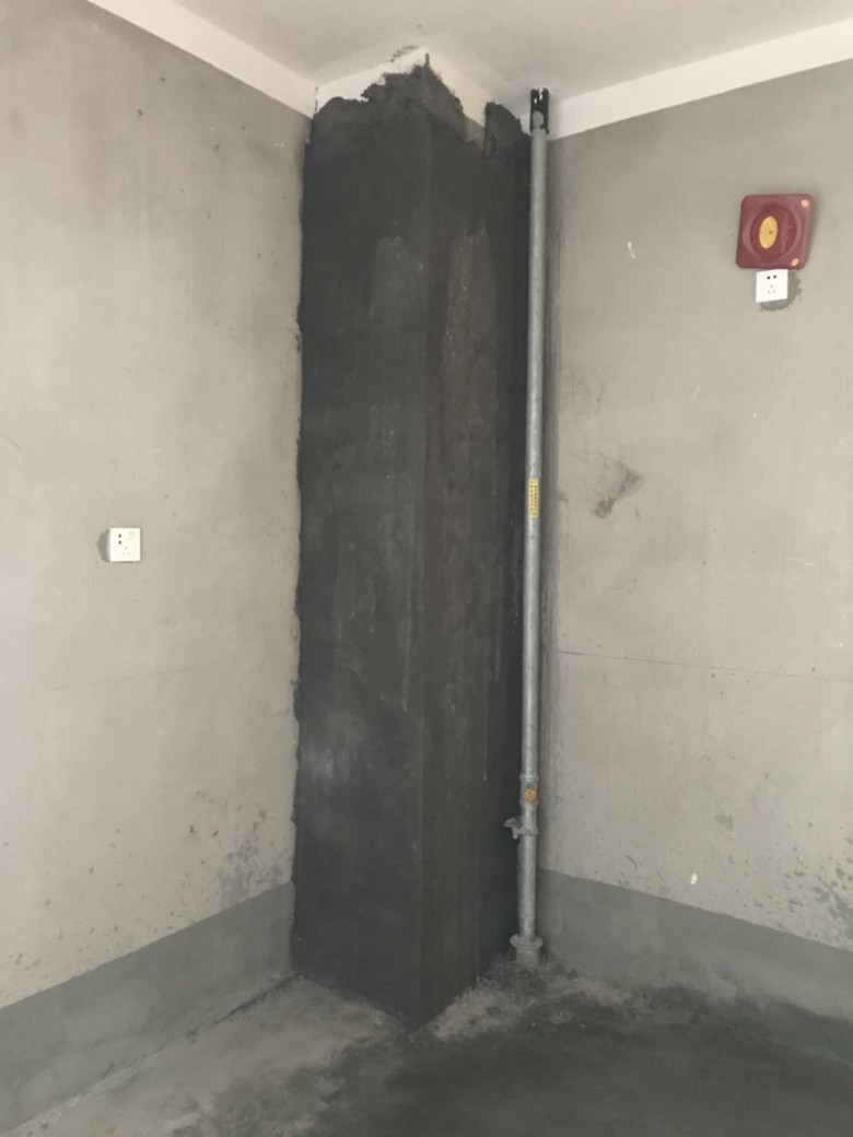 厨房的公共烟道部分,师傅又砌了一层薄墙,因为烟道会发热,不要小看这一层薄墙,它可以起到隔热的效果,否则时间久了以后可能会导致瓷砖空鼓剥落。我们把原有的烟道止逆阀让师傅给拆了,后续换成潜水艇的。