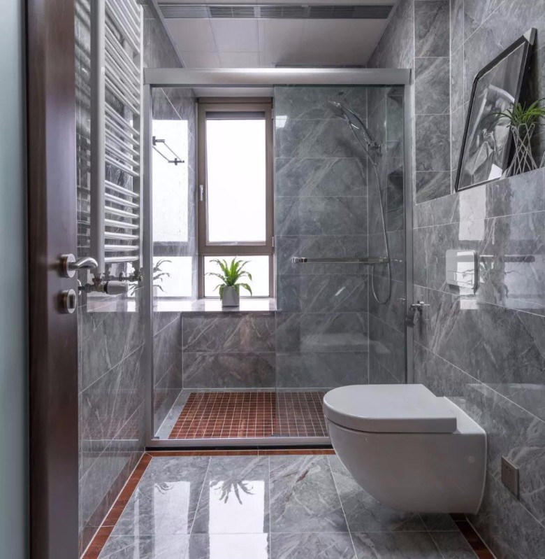 一般的淋浴区,要么是玻璃隔断,要么是浴帘,这个问题以前说过,反正各自有各自的优缺点,不同的业主根据自己家情况选择。 而本文要说的这种做法,基本上是用在玻璃隔断较多,很多五星级酒店都是这么做的,现在家装中也很流行,很多人选择这么做。 就是在淋浴区地面铺一块石材,石材上面拉槽,一方面是防滑,一方面是倒流。石材四周空出一圈用于排水,然后地漏靠墙放置,我还见过把地漏用石材隐藏起来的,感觉很不错,可惜当时忘了拍照。 这种做法由于石材价格以及加工费问题,一般比直接铺瓷砖会贵一些,还有就是设计的时候一定要把地漏位置安放在靠墙位置,如果原本户型下水管没靠墙的话,需要前期改水电的时候修改。 但下水管位置改动,如果不是下沉式卫生间的话,要注意改造后的排水管深度会不会影响防臭地漏的安装(深水封地漏一般需要12厘米深度以上)。 这种做法对于铺石材或者仿石纹瓷砖的卫生间来说整体性很好,看上去简单大气,清洁起来也比较方便。有时候装修中一点点改变就能增加实用性。