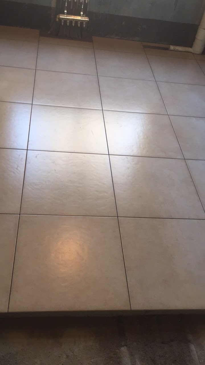 阳台地面瓷砖铺贴完成,师傅的手套放的,
