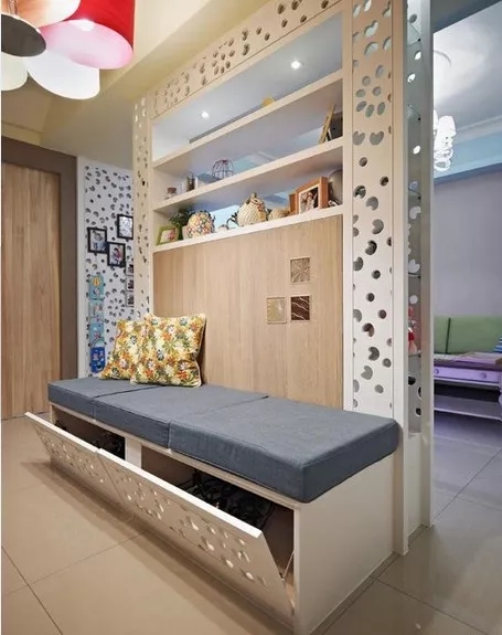 4、玄关如果采用隔断的话,千万不要使用不透光的隔断,尽量使用透明或者镂空的隔断,这样使得整个房间的通透性好,显得空间大。