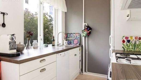 开放式的厨房,是小户型最常见的设计。木色台面搭配白色橱柜,简单而清新,也是北欧风格最常见的特点。
