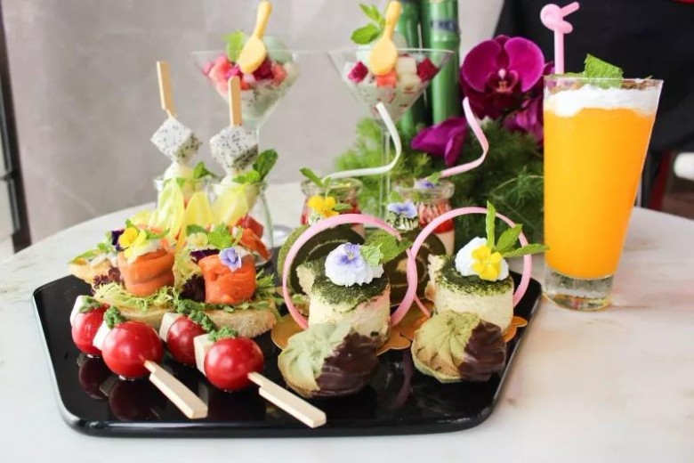 鲜虾配薄荷塔壳三文鱼三明治配酸奶油和薄荷番茄芝士及薄荷汁奥利奥绿茶芝士蛋糕薄荷水果冰激凌杯茉莉花奶茶冻绿茶瑞士卷抹茶曲奇新鲜水果杯配薄荷叶薄荷奶昔