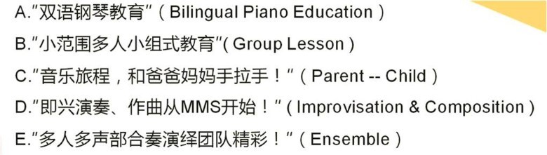 ★音乐课程针对2岁到60岁的学生分别设定不同等级,不同课程,市场宽广; ★本着“世界文化大熔炉”的理念,推广与教授各种类型的音乐,从古典到现代,从流行到爵士。 ★教学注重专业性与娱乐性相结合,即可为业余音乐爱好者领入音乐之门,也可为专业学生辅导,更可提供海外专业院校就学指南。