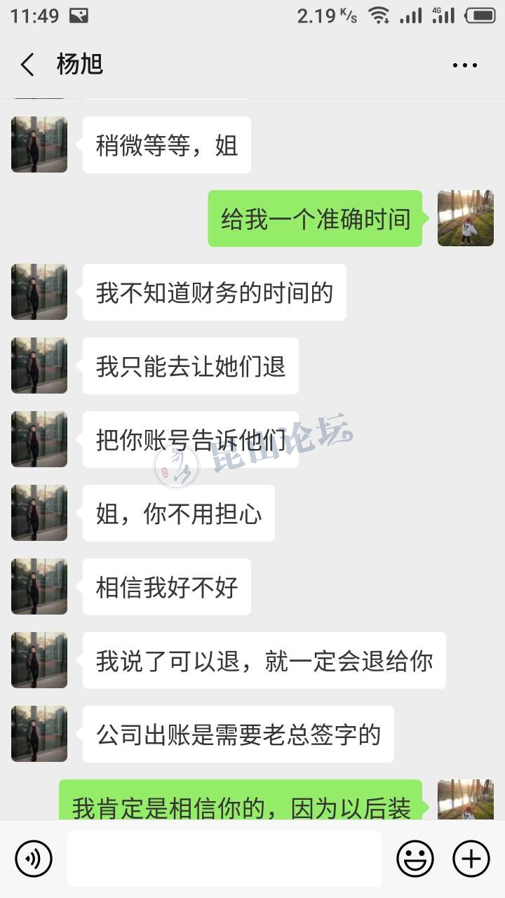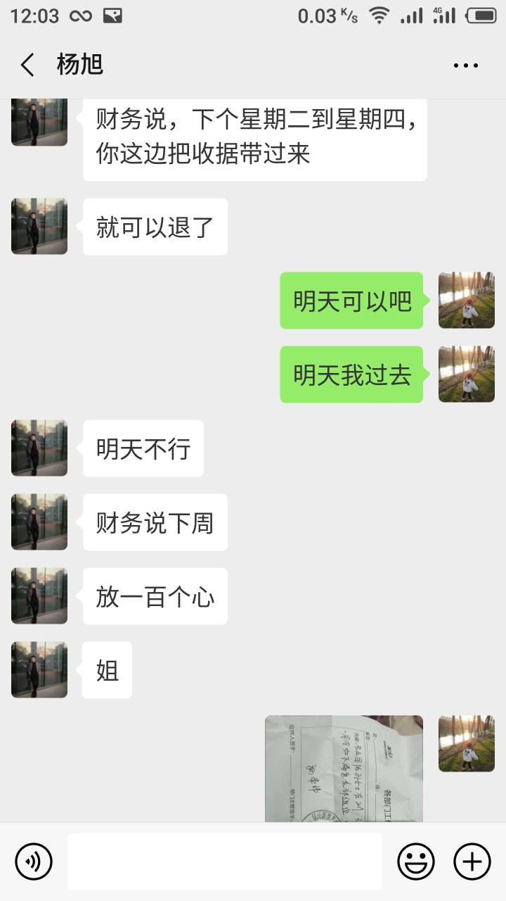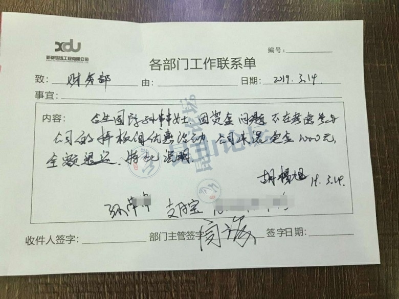 我们去交了1000块钱的预留金,也给我们写了一个证明,还盖了章,然后给了我们发票,他说如果一周内不考虑的话,他们就是把钱全部退还。后来我们回去想了想,感觉不对劲,我们说不考虑了然后让他退钱?设计师胡杨旭说公司每个月15号出账。要等到15号以后。他说他们两个财务都没有上班,一个得了妇科病,一个他家里老人去世啦,他说可以先让他们的老总给我开一个同意退款的字条。