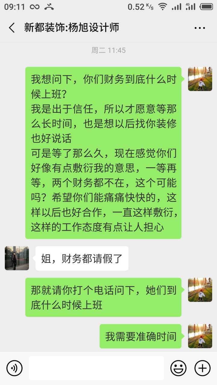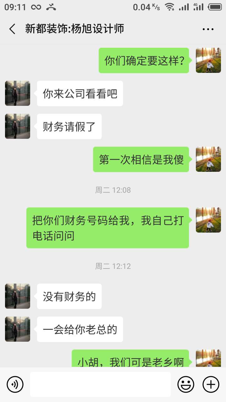 然后那个字条开好啦,他说等他们财务回来以后,他会交给财务让我把发票也一并给他,直接留个支 付 宝账号,等财务到了直接给我打钱,我没有给发票给他们,因为我我知道他们是骗子。然后又等等等了好几天,问那个新都装饰的设计师胡杨旭。他就是一直说财务请假啦,我自己带着小孩不方便过去,我老公上班,这个星期六星期天去跟他们要钱,没想到昨天星期四的时候,我看到了网上发的新都跑路了