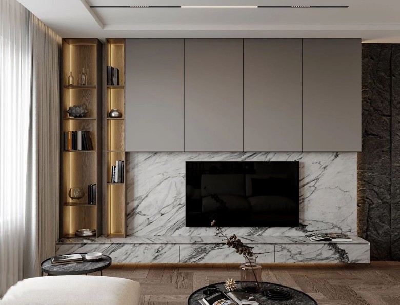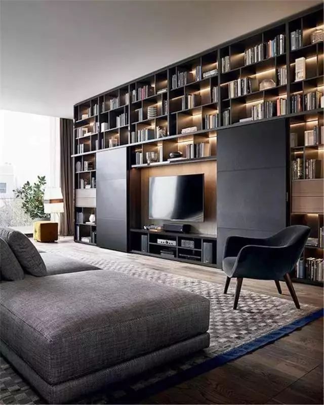 电视柜也可以采用现代式的地柜与吊柜结合设计,会更有个性感。而且居住者还能根据不同时期的需要作相应的变化,可谓是集功能性与灵活性于一体。