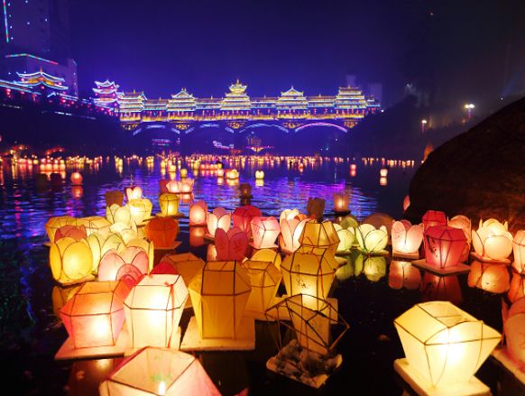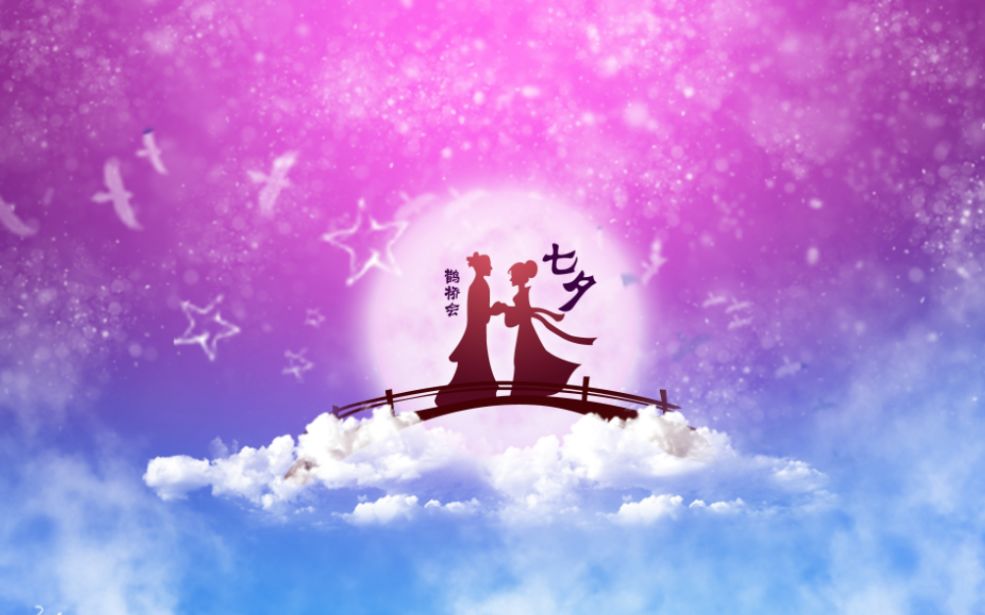 牛郎织女手牵红绸慢慢移动至鹊桥中央