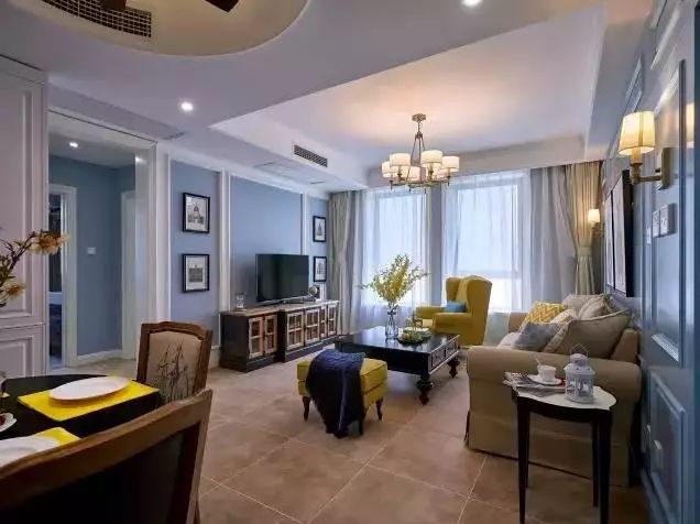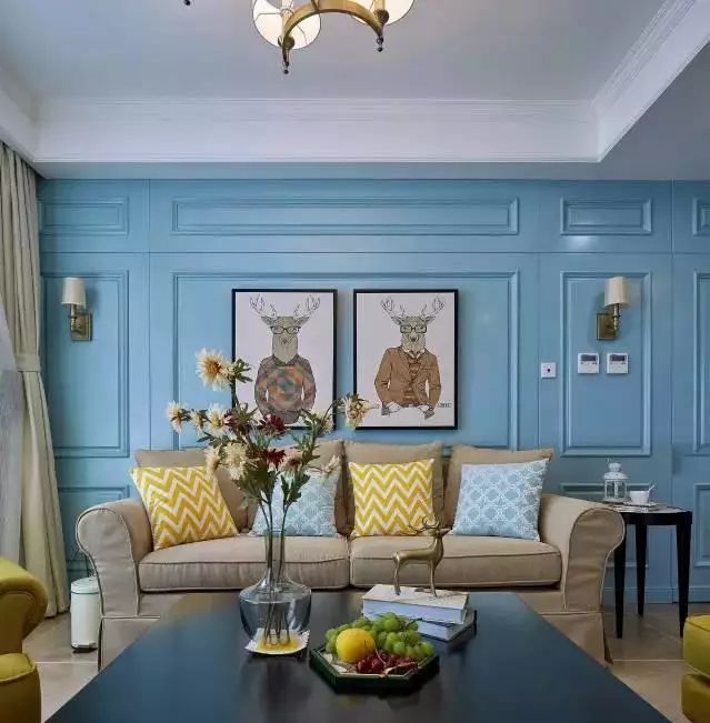 蓝色的造型墙,让屋内的气氛更加清爽。精致的壁灯和挂画也很好的装饰了墙壁。浅色的沙发搭配彩色的抱枕,实木的茶几和边几超级耐看,桌上放一瓶花,让客厅多了份生机盎然。大家注意那面蓝色的背景墙,暗藏玄机哦~请结合下面的图一起看!