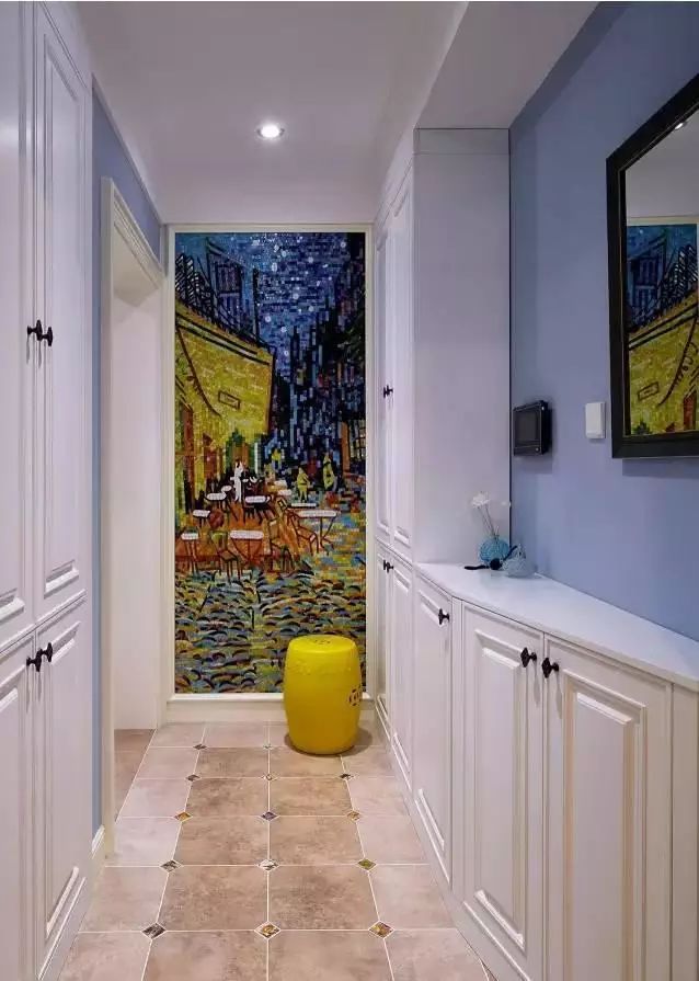 玄关处拥有超强的收纳能力哦~沿着两边的墙壁都做了储物柜,什么东西都可以放进去,让空间变得特别整洁。走廊尽头一整面墙的画作吸引人的眼球,这是梵高的作品,名为《阿尔夜间的露天咖啡座》,挂在这里瞬间就把整个空间的艺术感提升上来了。